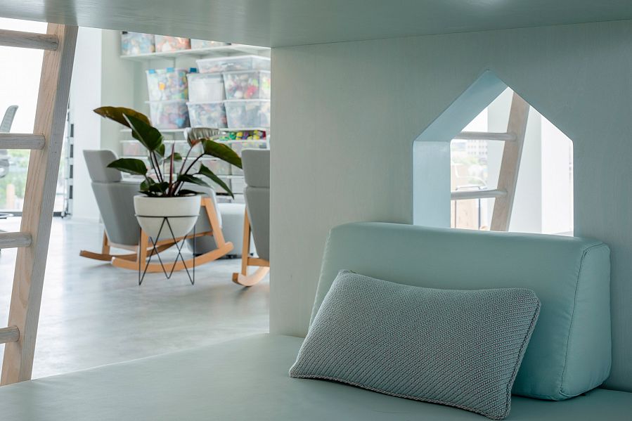 Уникальная зона — лаунж, где владельцы собак играют со своими питомцами, одновременно тестируя продукцию компании. Обивка мягкой мебели выполнена из искусственной моющейся отбеливателем экокожи. Две кухни укомплектованы столами с поверхностью из клена, а также светло-синими ламинированными шкафами. Стеклянные стены переговорных комнат декорированы графическими изображениями самых успешных в коммерческом отношении товаров фирмы.