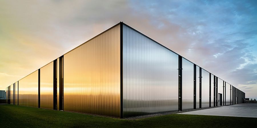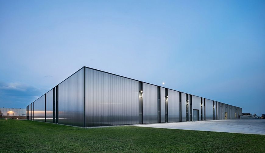 По словам авторов проекта, здание участвует в диалоге между землей и небом, светом и тенью. Фасады его частично светопроницаемы, поскольку сделаны из поликарбоната. Толщина каждой фасадной панели составляет 4 см, а высота – 10 м. Элементы навесного фасада крепятся на металлическую подсистему. Облицовочная панель склеена из двух пластин: задняя часть непрозрачная, а передняя обработана до зеркального блеска. В результате издалека кажется, что отражающая окружающую природу постройка буквально светится изнутри. «Вариативность – ключевое понятие в этом проекте, - утверждают архитекторы. – В зависимости от времени суток и интенсивности естественного света цвет фасадов меняется от черного к золотистому, а от золотистого – к металлическому. В целом здание демонстрирует очевидный факт: хорошая промышленная архитектура способна не только облагородить ландшафт и природное окружение, но и повысить качество офисного интерьера».