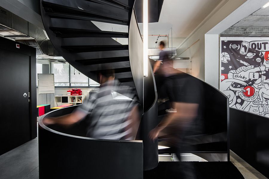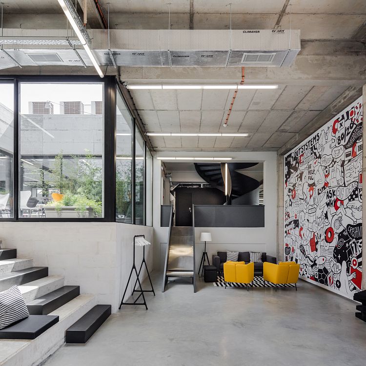 объему добавился новый, с открытым патио в верхней части. Кроме того, появилась новая стальная лестница, объединившая все основные функциональные зоны офиса. Необходимо отметить, что лестница оборудована подсветкой, подчеркивающей ее пластику. Последними штрихами реконструкции стали раздвижные двери, многоярусная аудитория для общих собраний (места для сидения в ней организованы по принципу стадионных трибун), а также стена, украшенная графикой уличной художницы Ванессы Теодоро.