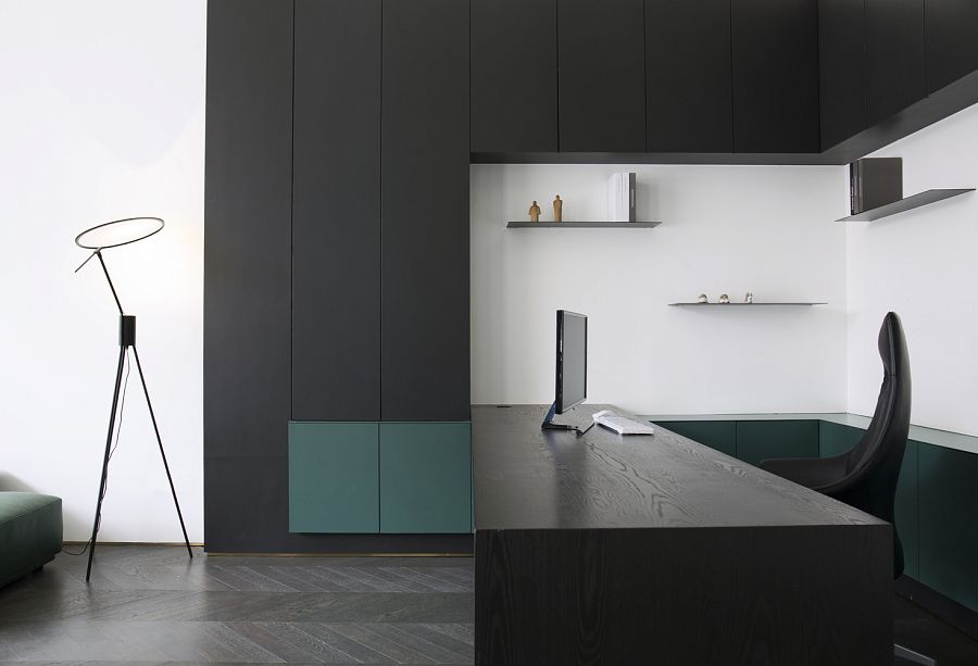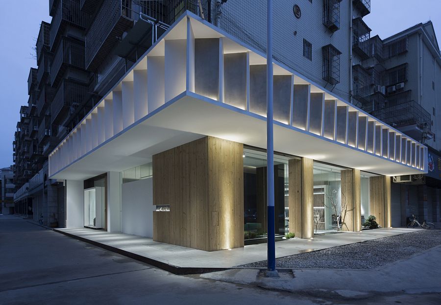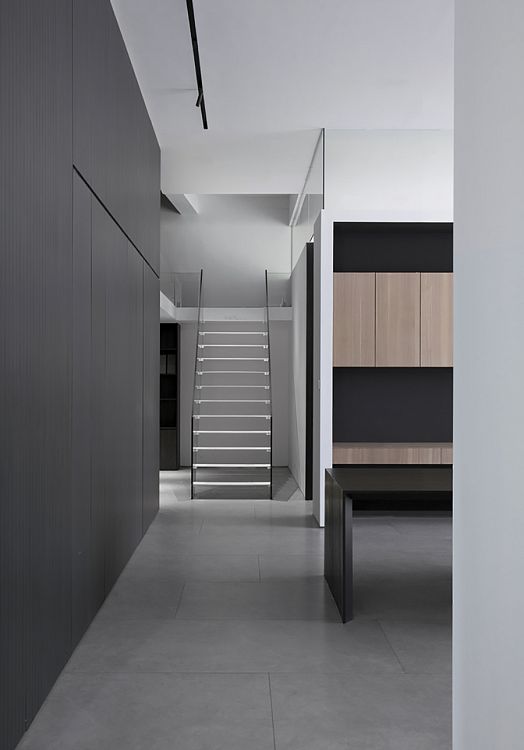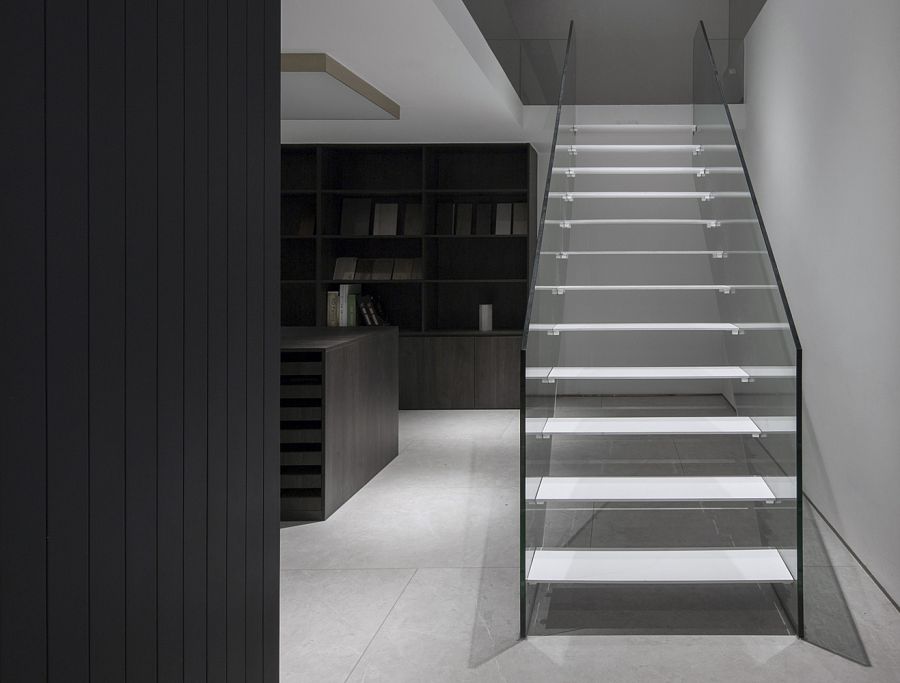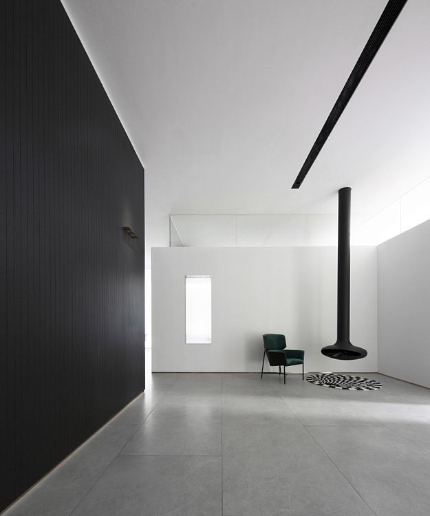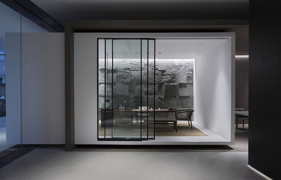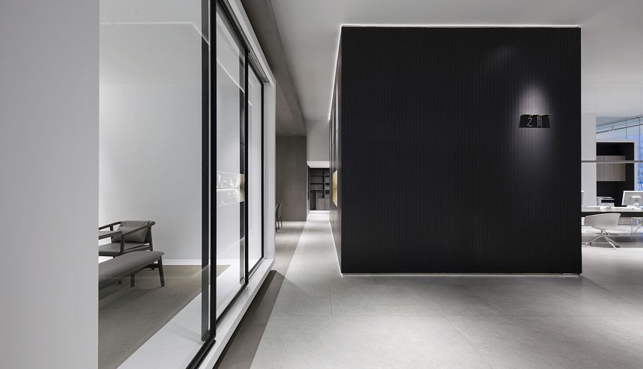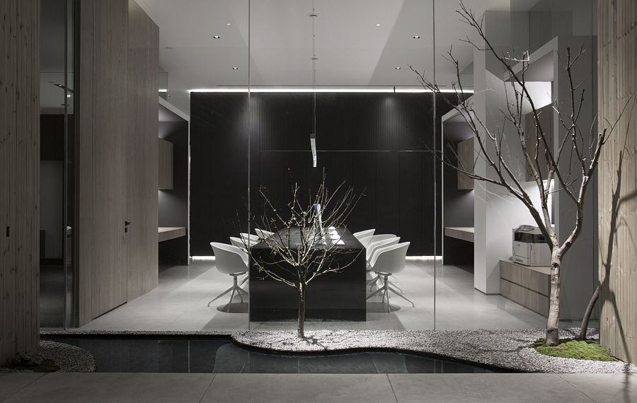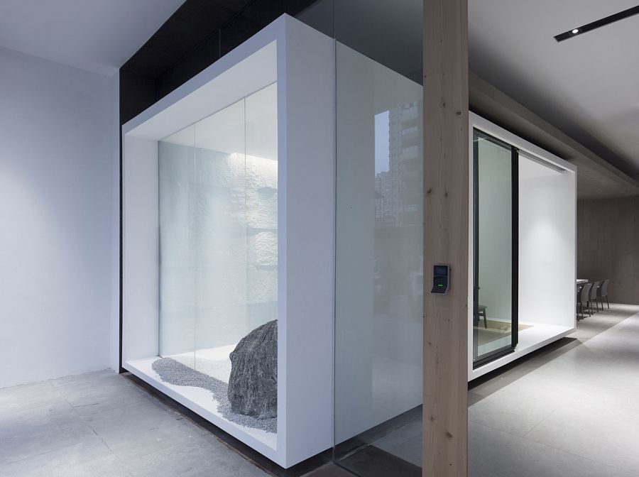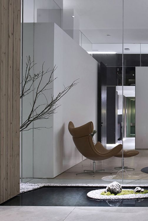 Для того, чтобы солнечный свет проникал внутрь, авторы проекта приняли решение заменить глухие стены здания на прозрачные панели. Вместо обычной входной двери появились ворота на электрическом приводе. Архитекторы досконально продумали подсветку входной группы и зоны рецепции. Сделано это было для того, чтобы эта зона как бы приглашала человека войти внутрь офиса. Здесь интерьер оформлен преимущественно в черно-белых тонах. Подвесной камин кажется необычной, но не избыточной деталью. Не выглядит лишней и чайная комната со стенами, отделанными грубым природным камнем.