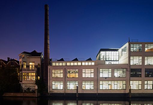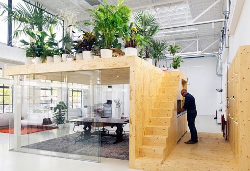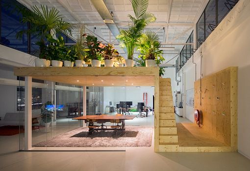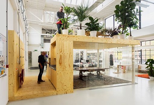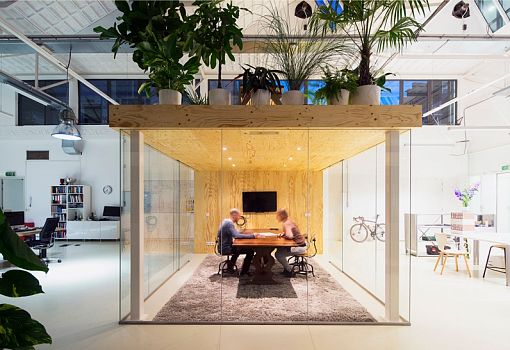 В здании бывшего завода в Роттердаме архитектурная студия Jvantspijker создала офис открытой планировки с небольшим крытым конференц-залом. Изюминкой этого застекленного зала для заседаний является сад на его крыше, позволяющий работникам немного передохнуть во время напряженного рабочего дня. Наверх ведет небольшая лестница. Деревянная обшивка и стекло позволяют акустически изолировать зал от остальной части офисного пространства. Дерево хорошо поглощает посторонние звуки, обеспечивая спокойную обстановку для личных и телефонных переговоров. Для организации пространства дизайнеры использовали лакированные листы фанеры, стекло, а также две стальные колонны.