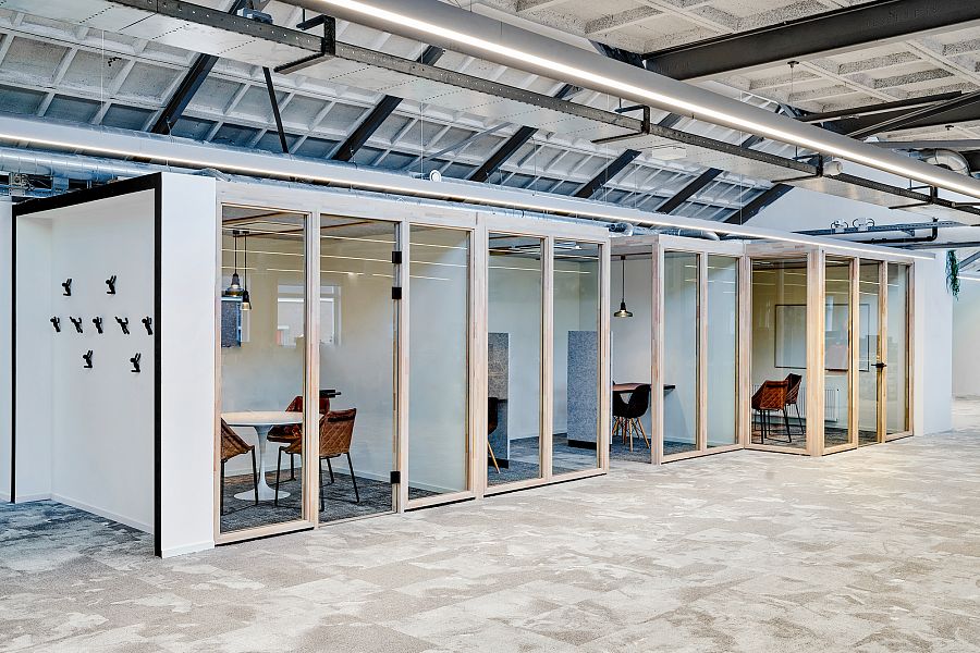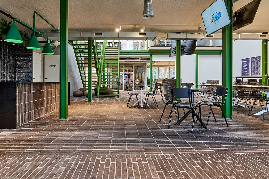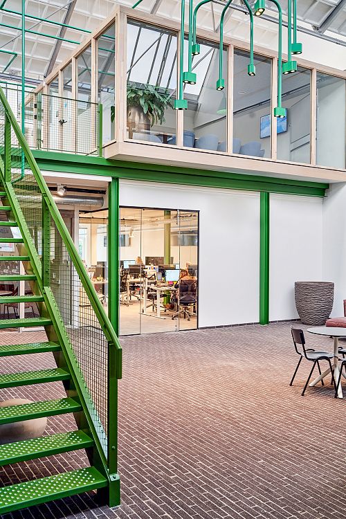 Речь идет о проекте приспособления промышленного склада на окраине Амстердама под офис технологической компании, специализирующейся в сфере IT. За дело взялись специалисты местного бюро Studio Rianknop. Согласно проекту, была демонтирована часть межэтажных перекрытий, чтобы в центре помещения площадью почти 2000 кв. м появился атриум с лестницами, галереями и ограждением из металлоконструкций, окрашенных в зеленый цвет. Эти металлические элементы воскрешают в памяти образ детского конструктора. На открытом пространстве архитекторы запроектировали отдельно стоящие объемы различного предназначения. Кроме этого, строители удалили все подвесные потолки, открыв для обозрения скатную кровлю бывшего склада.
