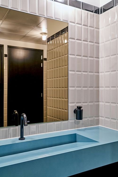 На первом этаже расположены основные офисные помещения, раздевалки, конференц-зал, санузлы. Кабинеты руководства, переговорные находятся на втором этаже. Они представляют собой частично остекленные объемы,отделанные бюджетной сосной. Технологическая суть компании-заказчика и самого интерьера прослеживается даже в дизайне светильников, спроектированных специалистами бюро BrandwachtenMeijer. В заключение стоит отметить, что в процессе строительства были использованы материалы вторичной переработки. К примеру, фойе вымощено таким кирпичом, а стены общей кухни облицованы «экологической» плиткой.