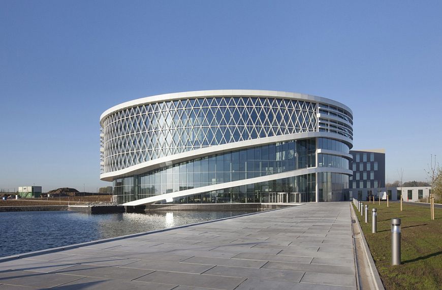 Полностью остекленный фасад округлого строения гарантирует хорошую естественную освещенность внутренних помещений. Разработчики также позаботились и о системе охлаждения. Проект Jaspers-Eyers Architects получился функциональным и стильным.