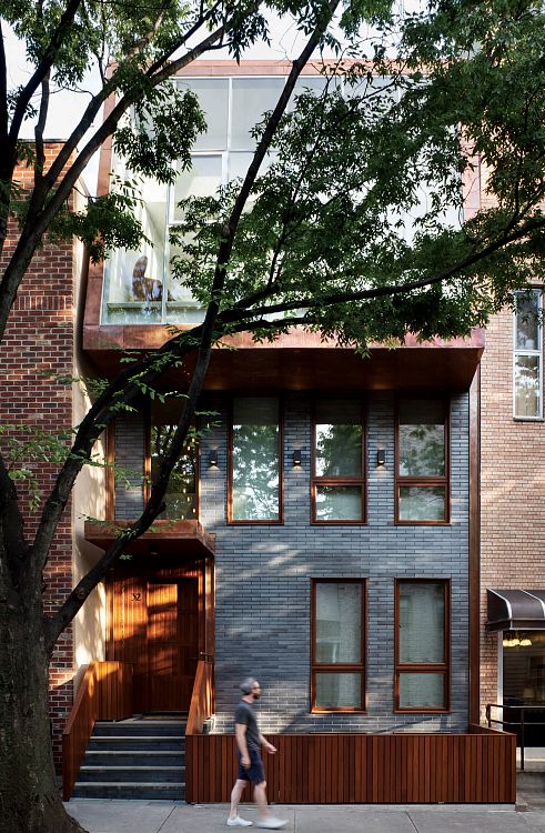 В результате реконструкции фасад таунхауса был полностью демонтирован и возведен заново. Архитекторы применили кирпич и деревянные оконные рамы для стены нижнего уровня. Верхний остекленный объем сооружен с использованием стальной витражной конструкции. «Так нам удалось привести здание в соответствие архитектурному контексту, — вспоминают авторы. — ведь многие дома в Нью-Йорке построены именно по такой технологии. Однако мы добавили некоторые детали, позволяющие интерпретировать типологию таунхауса по-своему».