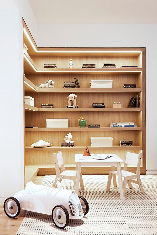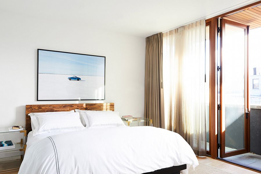 Двухсветная входная зона отделана деревом, а пол на кухне выложен серой керамической плиткой. Столешницы здесь мраморные. Таким образом, авторы проекта использовали в дизайне принцип контраста. На втором этаже запроектирована гостиная, три спальни и ванная комната. На третьем — спальня хозяев с гардеробной и ванной комнатой, а также кабинет. Из спальни можно пройти в крытое патио с видом на линию горизонта Манхэттена. Остается добавить, что спортивный зал, бойлерная, гостевая комната, помещение для стирки и кладовая расположены на цокольном этаже, ниже уровня земли.