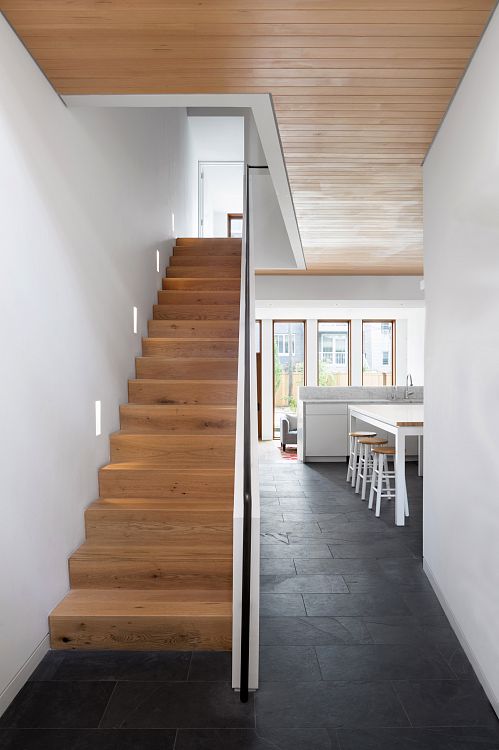 Архитекторы, очевидно, говорят о большом световом люке, прорезанном в надстроенном объеме. Действительно, благодаря этому элементу, выгодно отличающему обновленный таунхаус от соседних, интерьер стал значительно светлее.