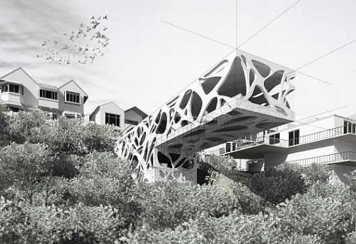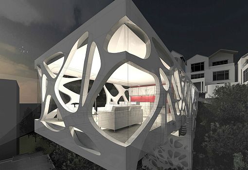 И еще о подражании природе. Инновационный проект Folly был предложен бюро archau для Новой Зеландии. Частное жилище в рендерах радует вплетением органических форм в композицию. Прямоугольная консоль, выстроенная в соответствии с особенностями ландшафта, является яркой архитектурной чертой будущей постройки. На создание подобного нетривиального элемента дизайнеров вдохновили просветы в кронах деревьев.