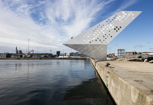 Функциональная скульптура появилась на берегу одной гавани в Орхусе (Дания). Инсталляция Sailing Tower похожа на оригами из перфорированной стали. С функциональной точки зрения она «работает» как обзорная платформа высотой в 7,5 метров. Интегрированная подсветка монохромной конструкции в темное время суток преображает отверстия, делая их похожими на иллюминаторы транспортных судов. Реализовали проект архитекторы Dorte Mandrup Arkitekter.