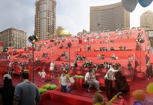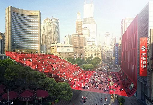 Red carpet – это урбанистическая концепция, придуманная архитекторами бюро 100architects для одной из площадей в центре Шанхая. Сутью бульвара, проходящего через эту площадь и соединяющего порт с метрополией, стала связь между Востоком и Западом. Это ось социальной активности города. Однако в последние годы здесь не хватало какой-то изюминки, которая бы привлекала посетителей. Именно поэтому и родилась идея «красной ковровой дорожки» впечатляющих размеров. Архитекторы спроектировали на бульваре открытый амфитеатр, приглашающий туристов и местных жителей насладиться различными культурными мероприятиями и просто отдохнуть от шопинга. С южной стороны, под трибунами, расположилось крытое помещение, внутреннее пространство которого используется как небольшой бар, где имеются общественные туалеты и другие удобства. Конструкция состоит из металлических ферм, поддерживающих сборные бетонные блоки, из которых выстроена горизонталь. Прочие элементы сделаны из красного дерева и металлических панелей. Стена здания напротив кресел и пешеходной зоны отделана перфорированными алюминиевыми панелями, и представляет огромный экран.