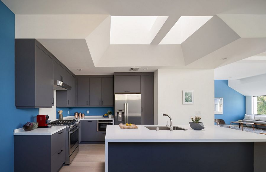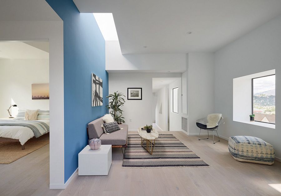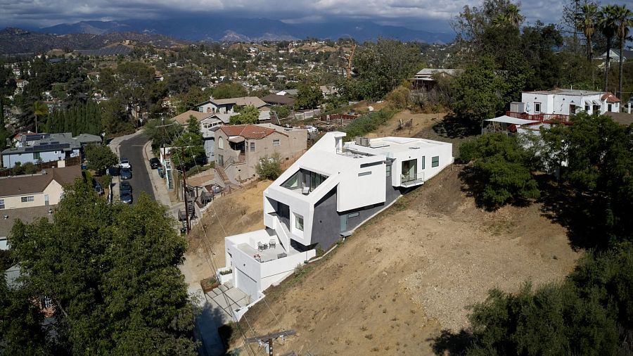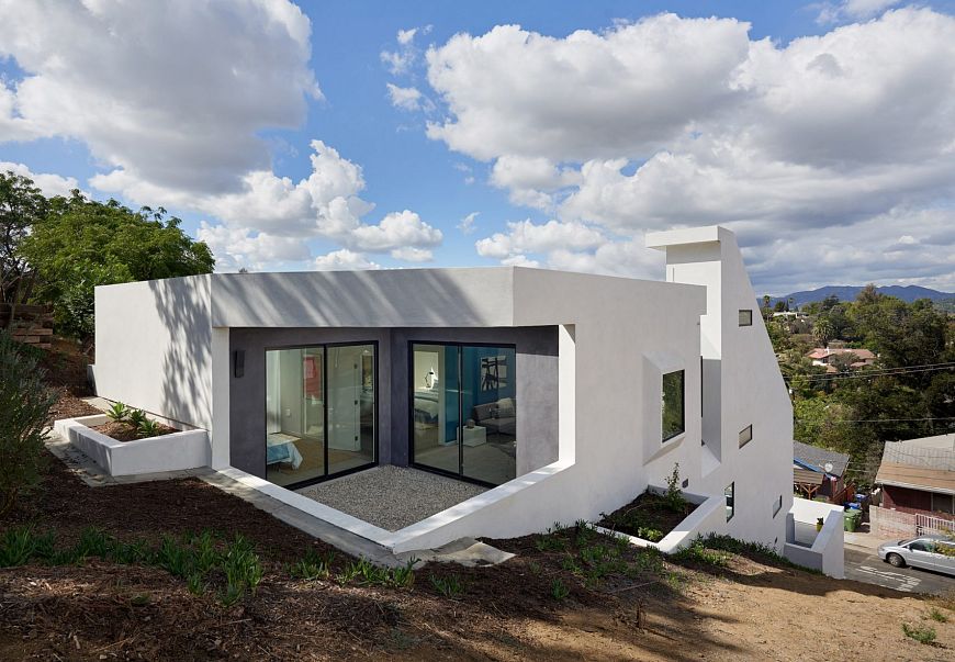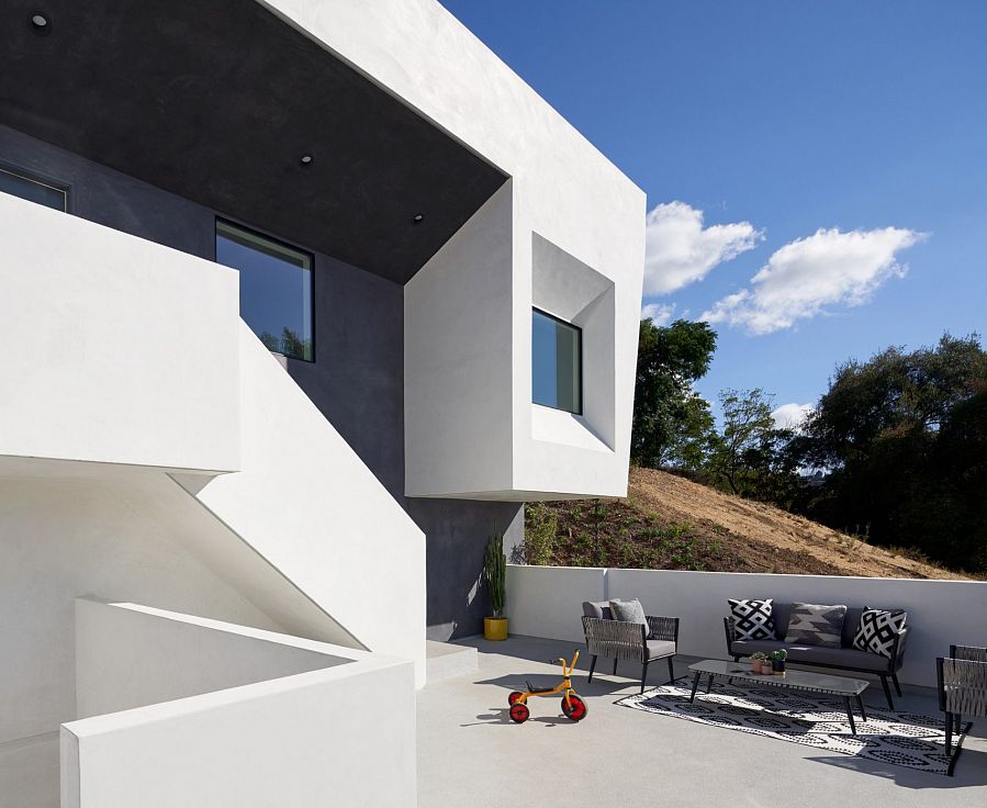 Но, пожалуй, самым удивительным можно назвать такой факт: по замыслу архитекторов, в любую интерьерную зону можно попасть снаружи благодаря обустроенному пространству вокруг здания. Дом состоит из трех объемных элементов белого цвета, словно бы сползающих с холма. В каждом из объемов можно обнаружить сквозные проёмы различной формы, которые обеспечивают проникновение в интерьер естественного света, а также отличные панорамные виды. «В этом проекте соединились сложные инженерные решения, связанные с местоположением дома, и нетривиальная объемно-пространственная модель: здание как будто разрезано в нужных местах и сложено по сгибу подобно бумажной головоломке», - говорят архитекторы.