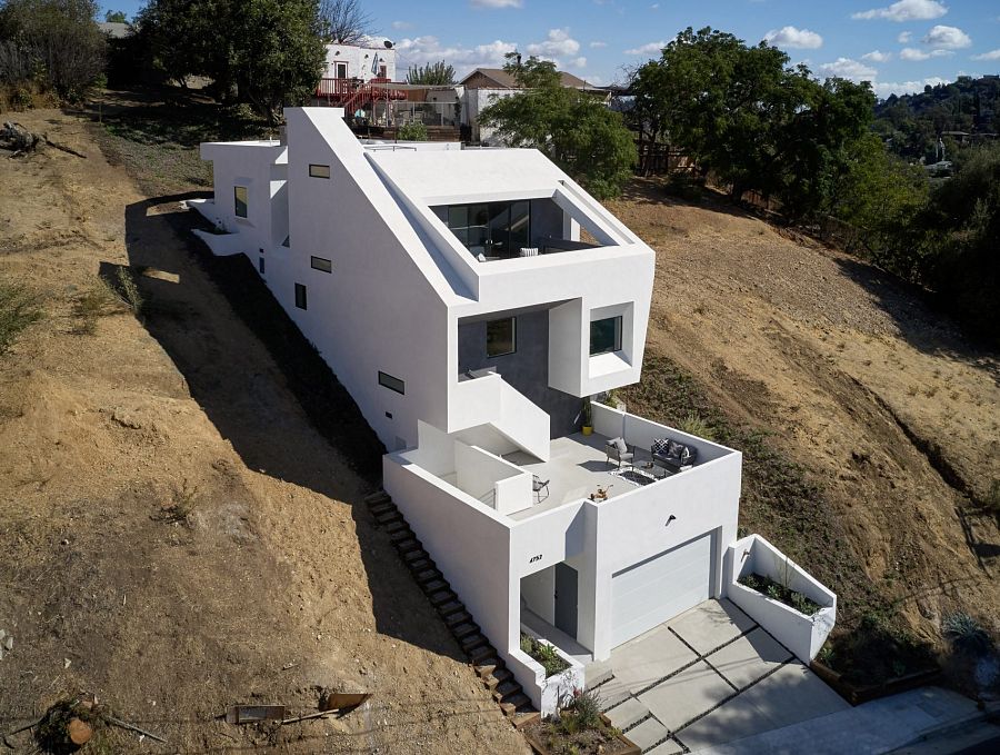 Частный жилой дом площадью 223 кв. м, спроектированный бюро Urban Operations, характеризуется наклонными стенами, узкими окнами и построенной «по мотивам» творчества Ле Корбюзье кровельной террасой.