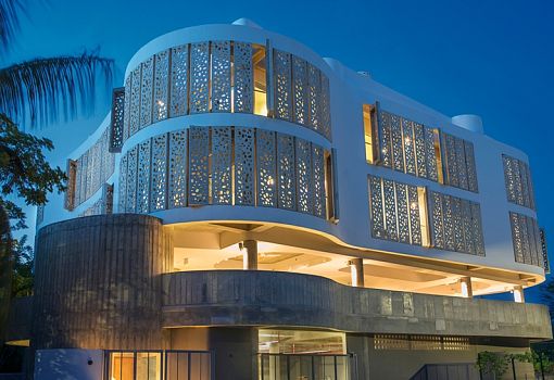 Проект гостиницы в Пуэрто-Рико был выполнен местной фирмой Fuster+Architects. Отличительная особенность дизайна – изогнутый фасад, экранированный стеклобетонными перфорированными панелями. Сквозные отверстия в них повторяют пористую структуру коралла. Благодаря перфорации внутрь здание проникает свежий воздух и солнечный свет.