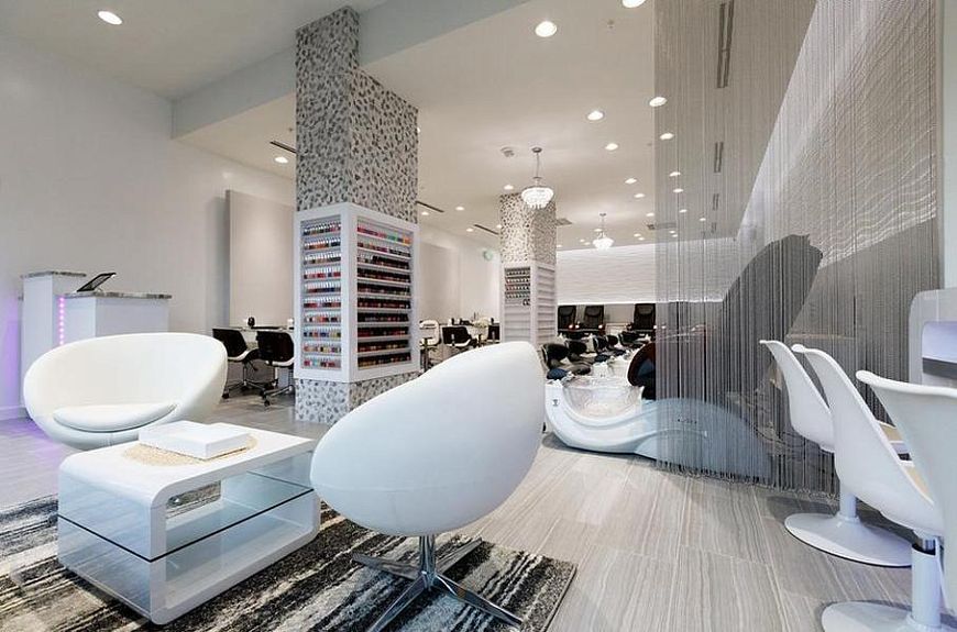 Американское бюро Atelier Mjk представило недавно открытый маникюрный салон в Вашингтоне. Скругленные формы стали лейтмотивом интерьерного дизайна: такое ощущение, что все предметы «сточены» для достижения плавных, «текучих» очертаний. Колористическое решение основано на контрасте светлых и темных тонов – от сливочного до шоколадного. Интересная деталь: для декора используются сопутствующие товары: так, на белом фоне радужно переливается объем, декорированный разноцветными лаками для ногтей.