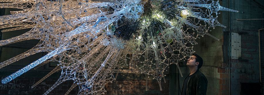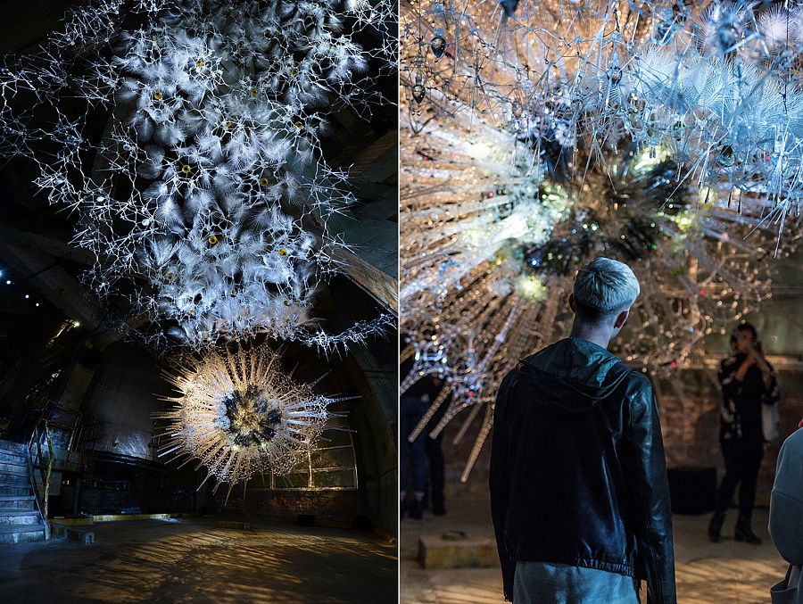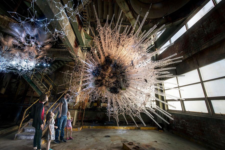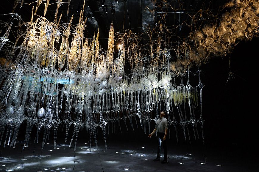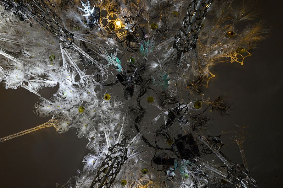 Инсталляция состоит из 300 000 (!) деталей и элементов – акриловых объемов, электронных сенсоров, напечатанных на 3D-принтере ламп, майларовых «веток», выдувных сосудов и так далее. Гигантская работа!