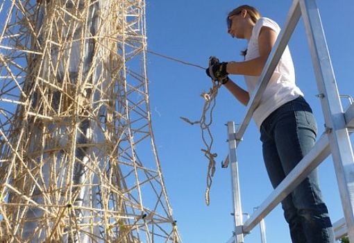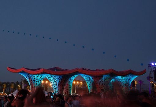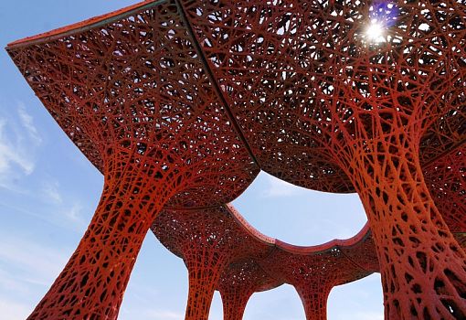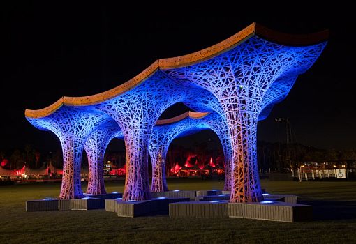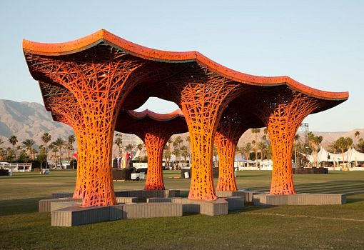 Необыкновенный открытый павильон в оранжевых и фиолетовых тонах возведен для ежегодного музыкального фестиваля в Калифорнии. Разработала и построила его команда дизайнеров бюро Ball-Nogues Studio из Лос-Анджелеса. «Целлюлозный павильон представляет собой кульминацию пятилетних экспериментов с композитными материалами», - рассказали дизайнеры. Колонны и навес ажурные, словно паутина. Тонкие решетчатые структуры созданы путем переплетения более 2200 метров бечевки вокруг опалубки. Засушливый климат региона ускорил процесс сушки составных частей павильона. После высыхания жесткие компоненты были сгруппированы вместе и объединены зубчатой крышей. Изюминка объекта в том, что весь он сделан из переработанной бумаги: макулатура перемалывалась в бумажную массу, смешивалась с водой и краской, в результате чего был получен надежный, дешевый и красивый строительный материал. Никакие дополнительные химические вещества к бумаге не добавляли, поэтому после окончания фестиваля павильон будет разобран и вновь пущен в переработку.