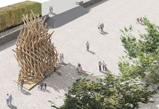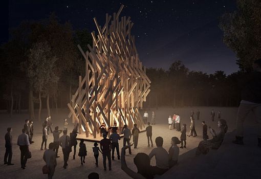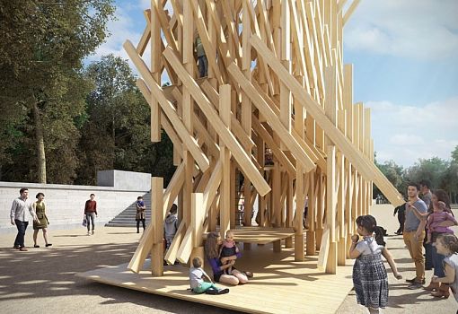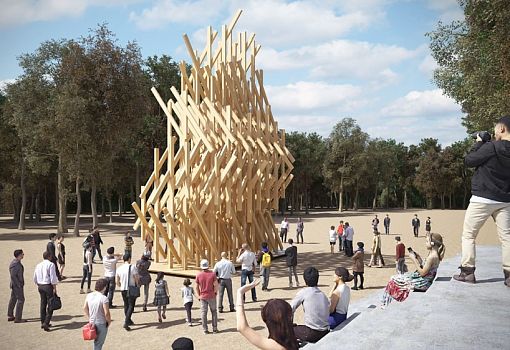 Японский архитектор Кенго Кума создал необычный временный павильон в саду Тюильри в Париже. Фирменный стиль Кенго Кума – воплощение традиционной японской культуры и ремесел в современных формах, сделанных, как правило, из дерева. Новый архитектурный объект японского мастера будет радовать глаз посетителей парка с 10 октября по 1 ноября, как один из творческих проектов, представленных в рамках художественной программы FIAC. Созданный из древесины лиственницы, павильон как будто колышется подобно деревьям, медленно раскачивающимся на ветру. Посетители могут побродить не только вокруг объекта, но и забраться внутрь.