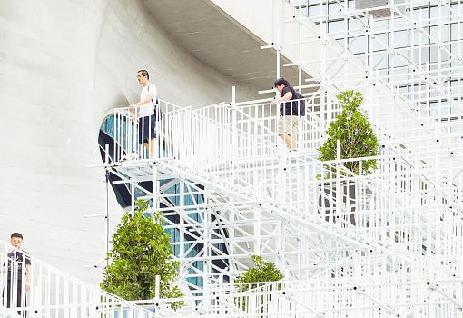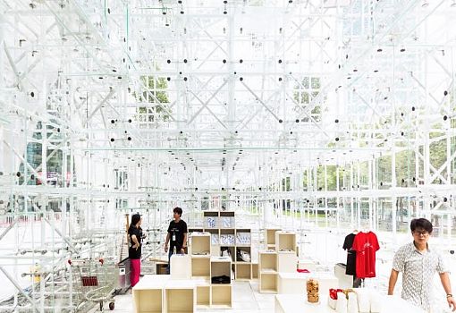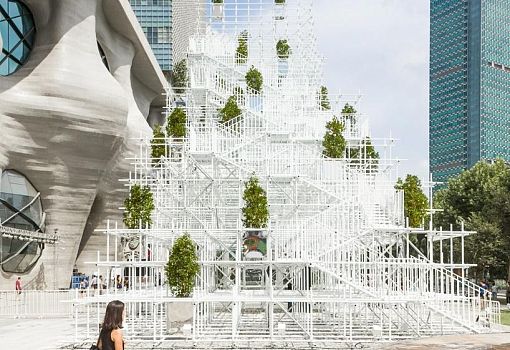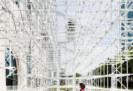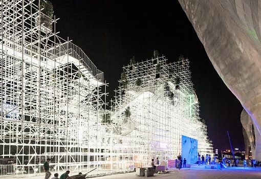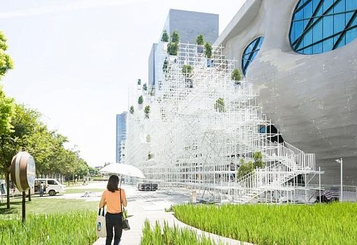 Памятуя о своем павильоне Serpentine, снискавшем международное признание еще в 2013 году, японский архитектор Соу Фудзимото создал аналогичную конструкцию в шанхайском Гималаи-центре. Концепция павильона Envision родилась из представления об архитектурном будущем человечества. Соу Фудзимото предлагает использование структуры строительных лесов, которая выступает в качестве «каркаса», а не вторичного материала для строительства. Общая площадь павильона составляет 670 квадратных метров, что позволяет создать открытое сообщение между его внутренними пространствами. В целом конструкция создает ощущение прозрачности и даже невесомости, а площадь под ним служит пространством для торговли, переговоров и проведения мероприятий.Тонкая структура павильона Envision заметно контрастирует с Гималаи-центром. Посетителям предлагается подняться наверх и блуждать по извилистым пространствам «строительных лесов», чтобы насладиться видами Шанхая с большой высоты.