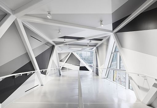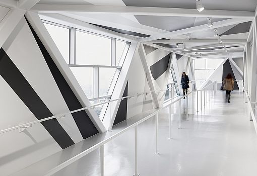 Снаружи темно-серая алюминиевая лента в форме зигзага почти точно повторяет стальную ферму моста и словно оборачивает его стеклянную конструкцию. На самом деле, конечно, остекление расположено в одной плоскости с алюминиевыми панелями, но визуально кажется, что они закреплены поверх стекла. Пространство внутри моста абсолютно отличается от его внешнего вида. Остроугольные фрагменты различных оттенков серого цвета разбросаны вокруг стального каркаса моста и треугольных окон. Вся эта конструкция создает ощущение «ломаного» пространства.