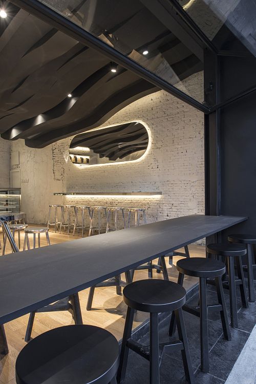 В этой оригинальной конструкции дизайнер передал «физическую формулу аромата кофе», по его собственным словам. Кроме потолка особенностями пространства являются минималистская стилистика с индустриальными мотивами, освещение в виде интегрированной подсветки и контрасты цветов.
