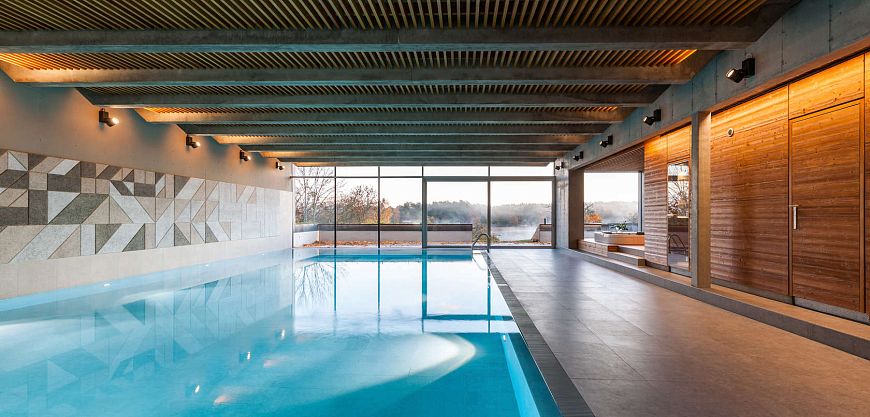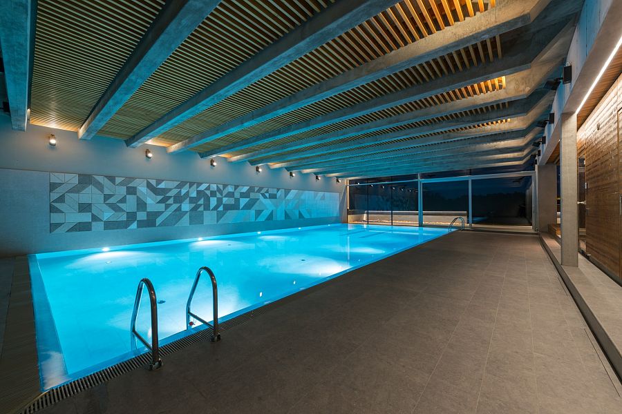 Благодаря особым свойствам этого элемента удалось создать открытые минималистские пространства бассейна без эха и отрегулировать влажность в помещении. Материал выполнен из натуральных деревянных волокон, которые поглощают излишки влаги, но могут и отдавать ее, что позволяет избежать гниения. Благодаря разнообразию решений плитка позволяет создать самые разнообразные проекты.