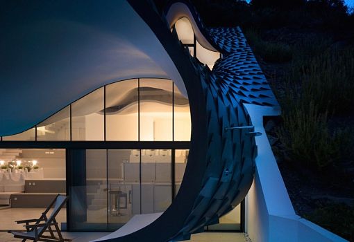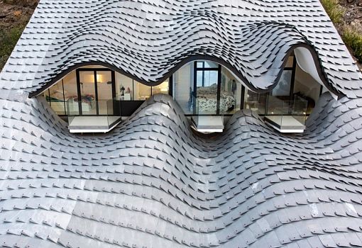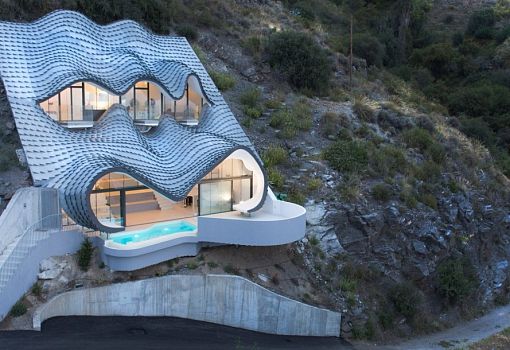 Интересный дом, буквально встроенный в склон холма, построили в Салобренье (Испания) по проекту бюро Gil Bartolomé Architects. Органические формы постройки, изогнутая металлическая кровля заставляют вспомнить полуфантастические структуры Антонио Гауди. В основе образного решения проекта лежат мифы о драконах. По мнению авторов, именно такой, как крыша этого жилища, могла быть чешуйчатая кожа этих могучих существ. Благодаря тому, что объем интегрирован в холм, достигается эффективная терморегуляция: круглый год температура в помещениях не превышает 20 градусов.