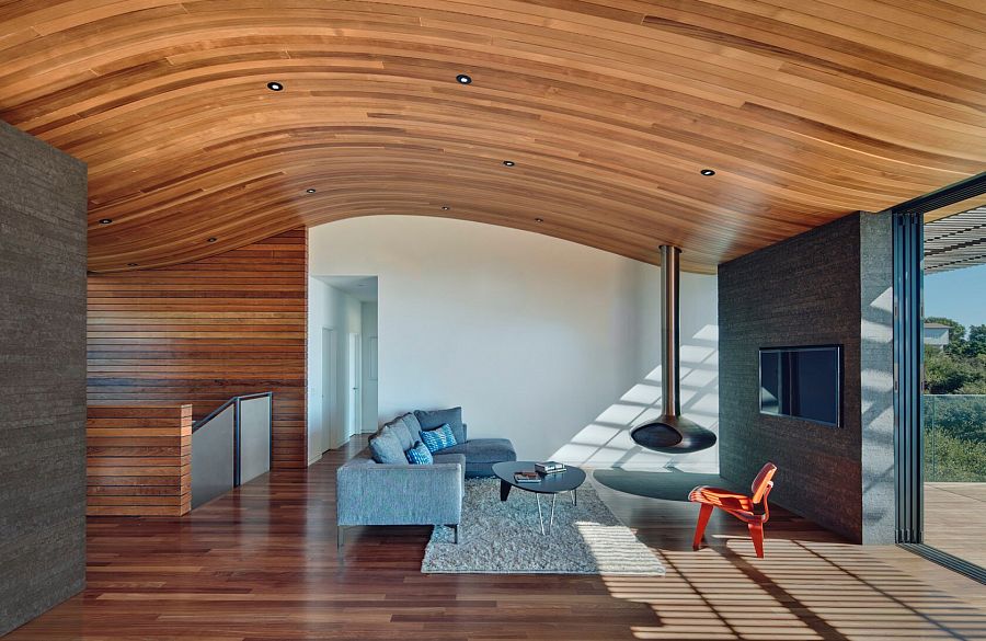 Большой плюс нового дома – почти сплошное остекление главного и заднего фасада, за счет которого интерьер становится максимально доступным визуально. Главное жилое пространство – одно большое помещение, разделенное на зоны. Оно связывает сад и передний двор. Главным материалом проекта стало дерево.