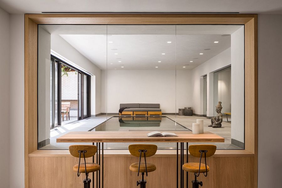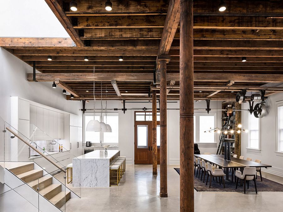В соответствии с концепцией, фасад оставлен практически без изменений. Главный вход ведет в вестибюль, откуда попадаешь в основное жилое помещение, состоящее из кухни, гостиной и столовой. Архитекторы сохранили оригинальные деревянные балки, колонны, бетонный пол и элементы оснастки промышленного здания. Все эти детали гармонично вписаны в обновленный интерьер. Большая стеклянная дверь раскрывается во внутренний двор, запроектированный вдоль одного из боковых фасадов. Здесь же, на первом этаже, запроектированы четыре небольших спальни, двери которых выходят в общий коридор. Главная спальня расположена в надстроенном на крыше объеме, отделанном оцинкованным железом. Уровни дома связаны металлической лестницей. Кроме спальни внутри объема запроектированы гардеробная, ванная комната и кабинет. А еще на крыше разбиты две открытые террасы.
