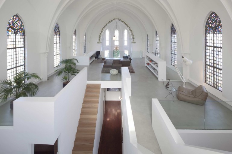 Визуально жилые пространства обособлены, но связаны с историческими элементами, например, витражами. Для лучшей инсоляции добавлены новые большие окна. Белоснежные стены лишены традиционных для подобных строений элементов – колонн и арок.