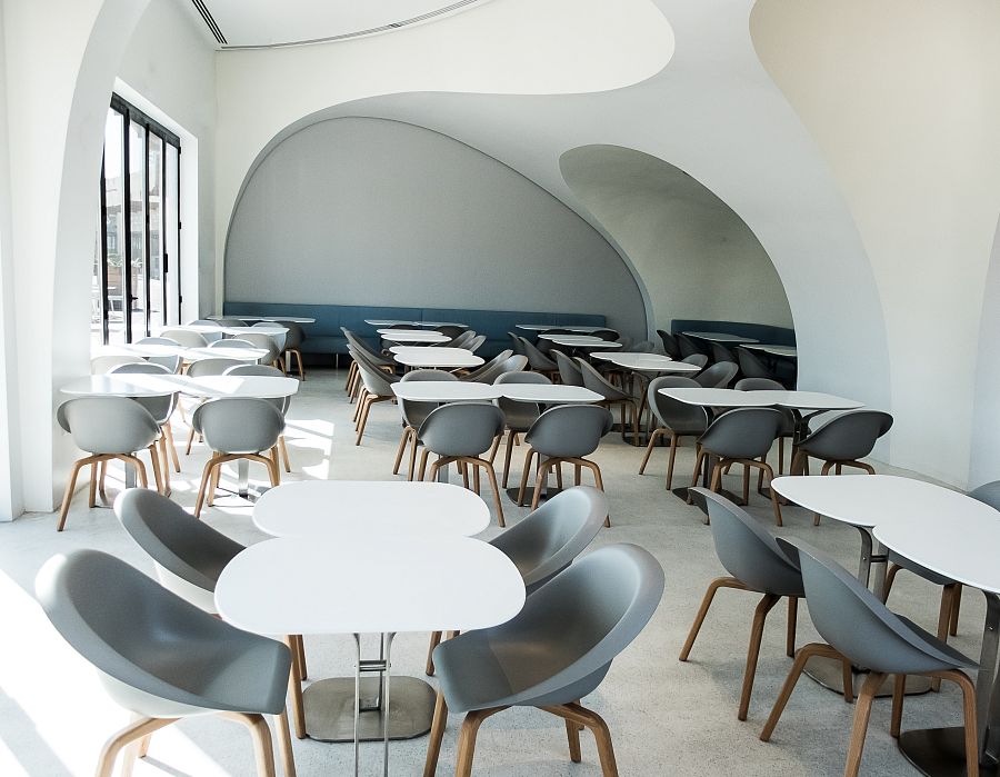 Он применил традиционный для себя прием, соединив эстетику 50-х готов со «стилистикой будущего», создаваемой самим автором. Примером этой стилистики можно назвать криволинейные вырезы во внутренних стенах ресторана. Колористическое решение характеризуется использованием сдержанной холодной гаммы.
