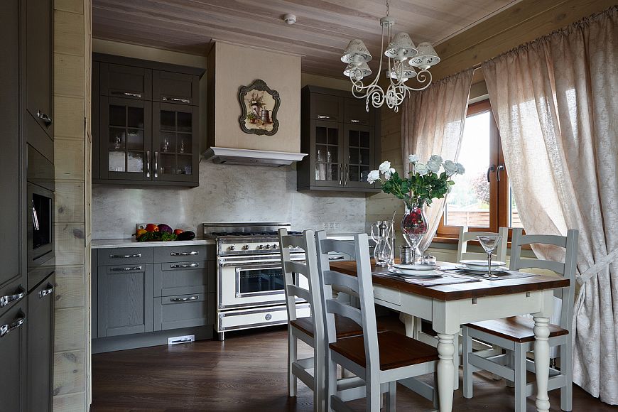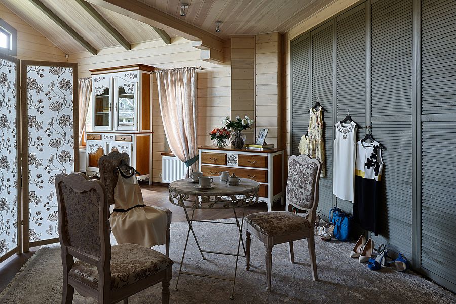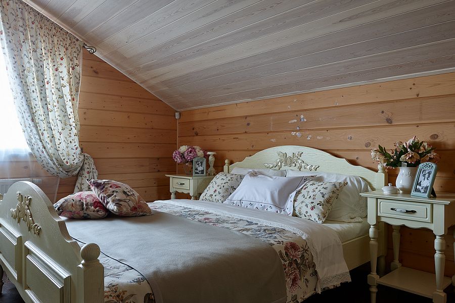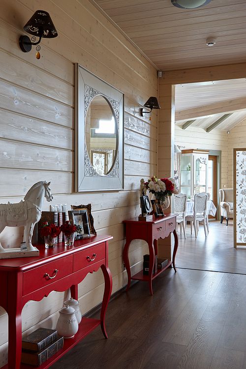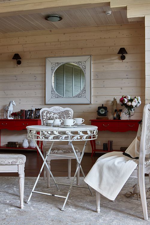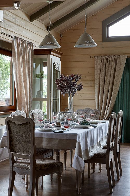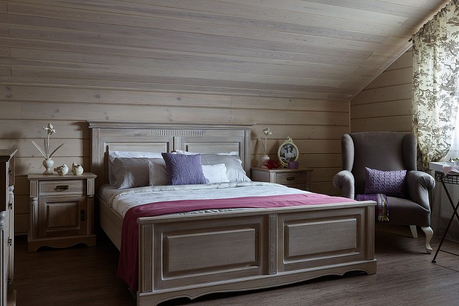 Тепло дерева, преобладающего в интерьере в строительных и отделочных материалах, мебели и аксессуарах, гармонично сочетается с теплыми оттенками в текстиле.