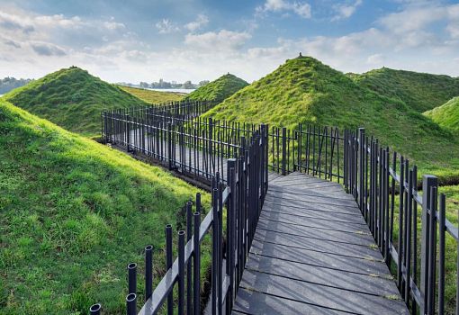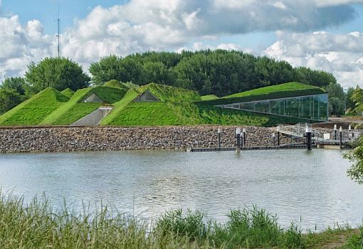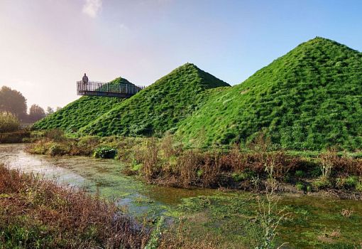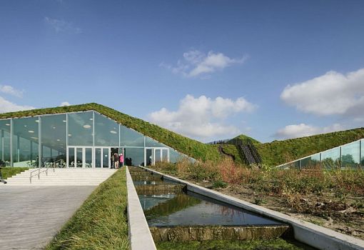 Можно с уверенностью сказать, что музей Biesbosch в Нидерландах переместился под землю в рамках реконструкции усилиями бюро Studio Marco Vermeulen. Расположенный на искусственном острове Biesbosch общественный центр увеличился за счет нового крыла площадью 1000 кв.м. с выставочным пространством, рестораном и офисами. Композиция представляет собой сочетание пирамидальных объемов, покрытых грунтом и растительностью. Архитектуру выдают только остекленные элементы фасадов и оригинальной формы лестница, которая позволяет прогуляться по пирамидам.