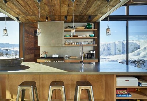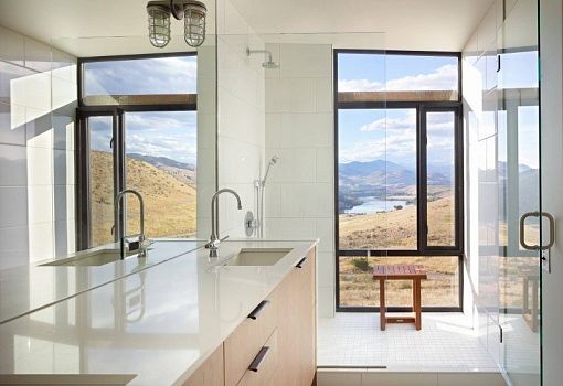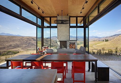 К северо-востоку от Сиэтла есть горная долина, где ничего не растет, кроме степной травы. Заснеженные горные вершины отражаются в зеркальных озерах, в реках прыгает непуганая форель: американский Запад в своей первозданной красоте. Именно это великолепие вдохновило архитектора Тома Кундига (Tom Kundig) на создание необычного ансамбля жилых павильонов по заказу состоятельной семейной пары. По замыслу автора, спальня запроектирована внутри отдельного павильона. Таким образом, каждое утро обитатели дома делают несколько шагов под открытым небом (независимо от погоды и температуры!), чтобы попасть в гостиную. Вечером так же они попадают в спальню. Стеклянные стены основных павильонов сдвигаются, так что летом здесь может быть создано полностью открытое пространство, в то время как в зимний период хозяева имеют возможность сидеть в закрытом помещении рядом с теплым и уютным камином.