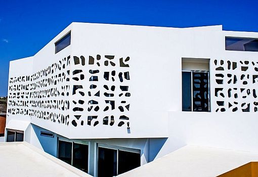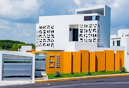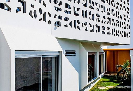 Дом Nest House (Альварадо, Мексика), созданный бюро Gerardo Ars Arquitectura, обладает уникальным силуэтом во многом благодаря белоснежным перфорированными экранами, интегрированным в минималистский объем, и ярко-оранжевым ограждениями в виде чередующихся плоскостей. Экран выполняет не только эстетические функции, но и защищает жителей от ветра и зноя, а также увеличивает интенсивность естественного освещения в интерьере.