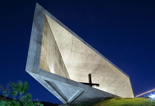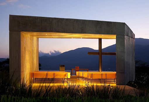 А это уже другой вариант религиозного сооружения – асимметричная минималистская часовня в Сальвадоре, построенная по проекту местной студии EMC Arquitectura. У бетонного призмовидного объема нет двух противоположных стен: благодаря этому из часовни открывается прекрасный вид. Кроме того, здесь хорошая естественная вентиляция (что в тропическом климате важно). Одна из двух пересекающихся балок, поддерживающих структуру изнутри, обрывается, формируя крест, который находится в передней части часовни. Строгие ряды деревянных скамей обращены к кресту, а за ним, собственно, и открывается панорамный вид. Использование местных материалов – дерева из леса и камня из ближайшего карьера – «привязывает» объект к природе и ландшафту.