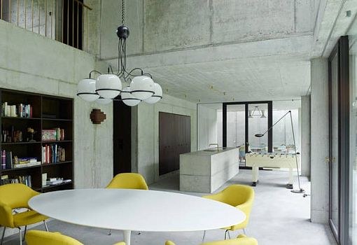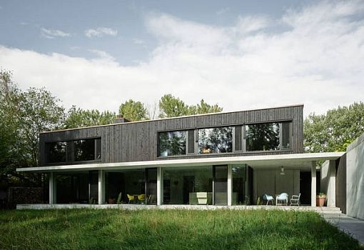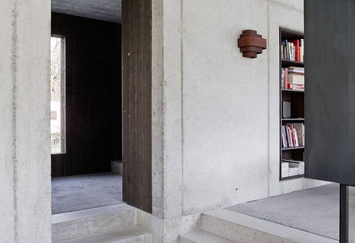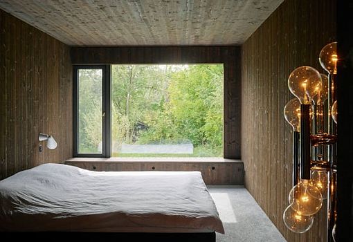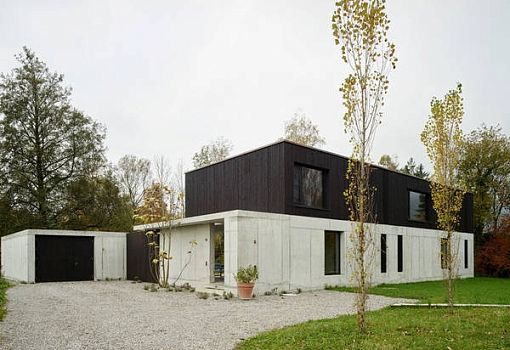 Здание с бетонным основанием, и скрытым входом увенчанное темным деревянным кубом. Так выглядит дом от швейцарской архитектурной студии mlzd, выполненный в эклектичном стиле. Снаружи он кажется закрытым и сдержанным. Зато внутри скрываются просторные комнаты с открытым видом на окружающие леса. Особняк расположен неподалеку от озера Билль, среди высоких деревьев. Нижний, бетонный уровень здания включает в себя сервисные, вспомогательные и общественные помещения: ванные комнаты, гардеробную, столовую и так далее. Наверху располагаются личные комнаты членов семьи. Не только этажи здания связаны друг с другом, но также интерьер и экстерьер переплетаются между собой, взаимопроникая и образуя индивидуальное неповторимое пространство.