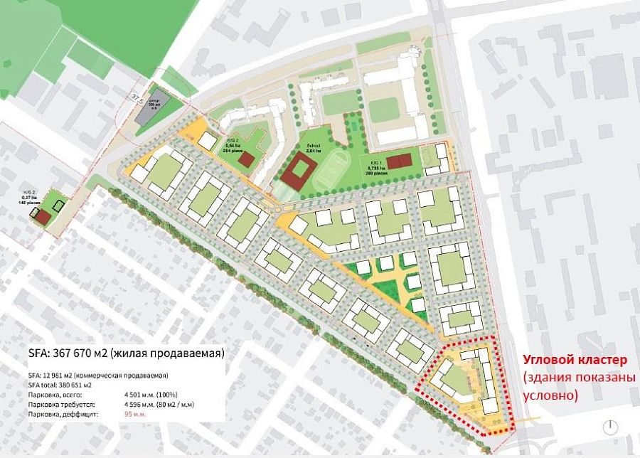 Компания «Брусника» предлагает подумать над концепцией архитектурно-градостроительного решения так называемого «углового кластера» — квартала улиц Шаумяна — Московской — Фурманова. По мнению девелопера, эта часть квартала может стать доминирующим элементом застройки всего района и к нему предъявляются повышенные архитектурно – градостроительные требования. Кроме того, важной задачей является разделение в рамках одного квартала частной и общественной функции. Угловой квартал будет открывать систему пешеходных пространств, которая запланирована внутри участка и будет являться, своего рода, входной группой для всего микрорайона.
