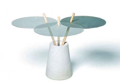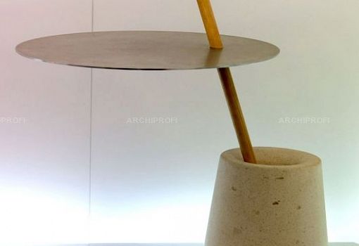 Леони Аретц (Leonie Aretz) спроектировала конструктивно необычный столик 42K: его круглая столешница насажена на деревянный стержень, который свободно вставляется в узкое высокое каменное основание, весящее 42 кг. Стержень может находиться в разных позициях, но столешница-диск остается при этом в сбалансированном горизонтальном положении.