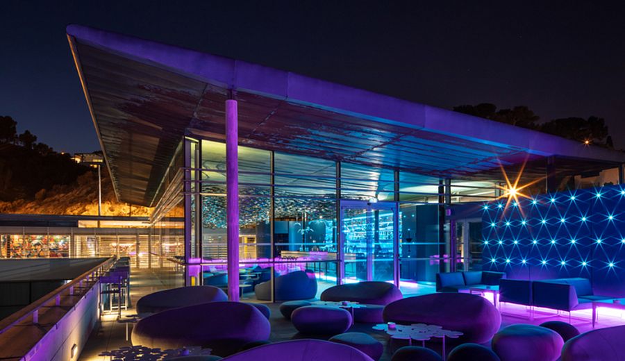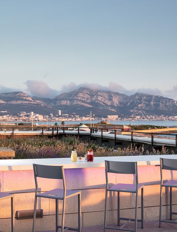 Перед французской группой заказчики поставили задачу создать «аутентичный марсельский интерьер – узнаваемый и вдохновляющий». Лейтмотивом дизайна, как нетрудно догадаться, стала морская тема. Так, гостиничный холл устлан коврами оттенка океанского дна, а стены и потолок декорированы фотоизображениями пловцов и дайверов. Так называемый Туннельный бар оформлен в виде перехода между зоной спа (пресная вода) и холлом (солёная морская вода); он обставлен знаменитой мебелью от Гаэтано Пеше (кресло Upдля B&B Italia) и Тора Бунтье (кресло Shadowyдля Moroso). Изюминка другого бара, SkyBar, запроектированного на третьем этаже отеля, - оригинальный светильник английского художника Фрэнсиса Бромли, состоящий из 4 000 стальных сардин.