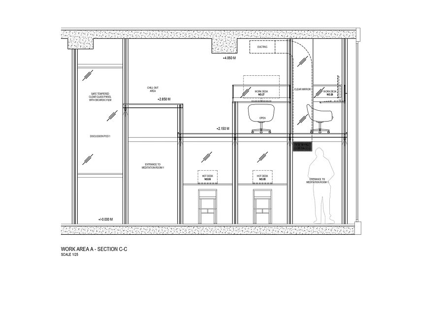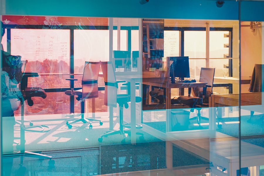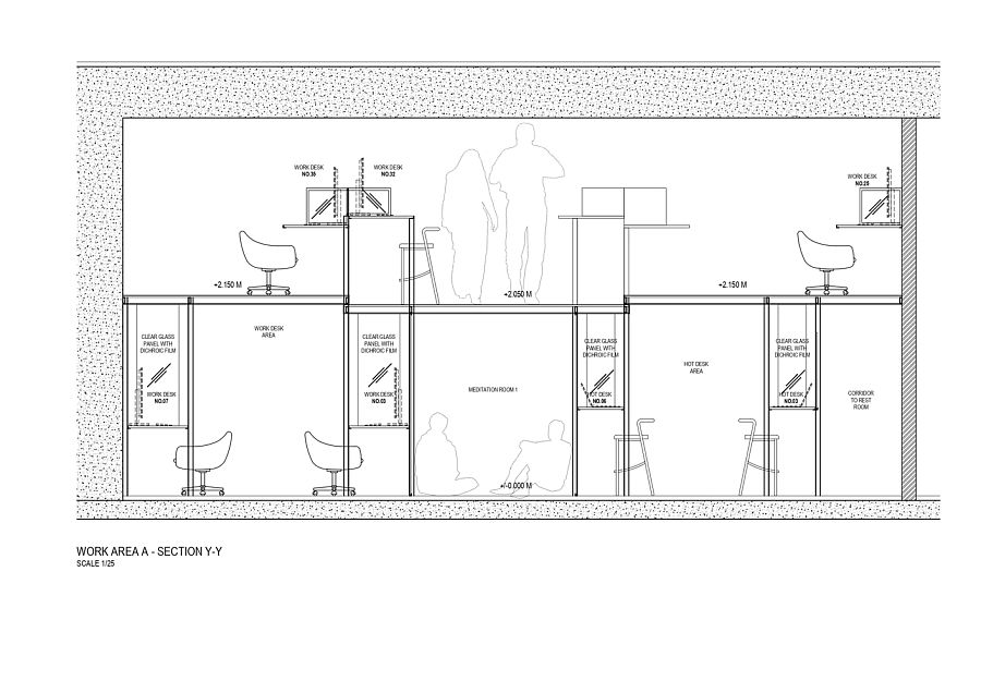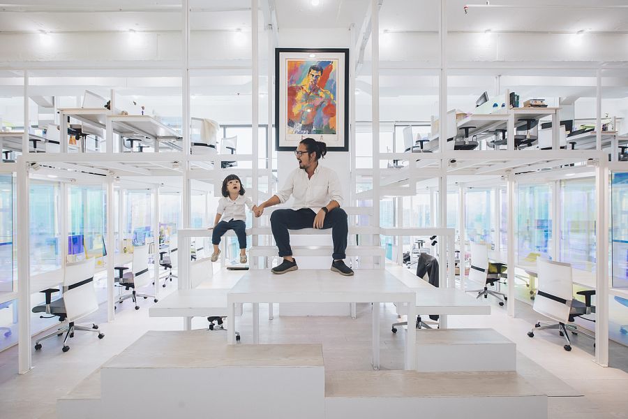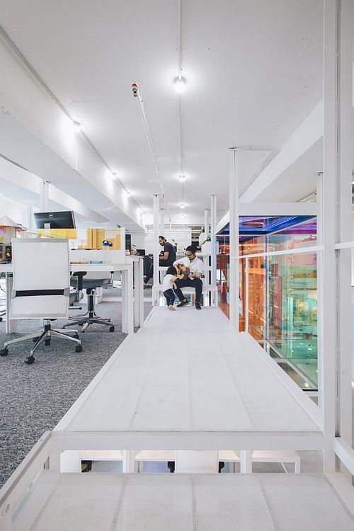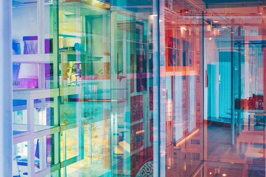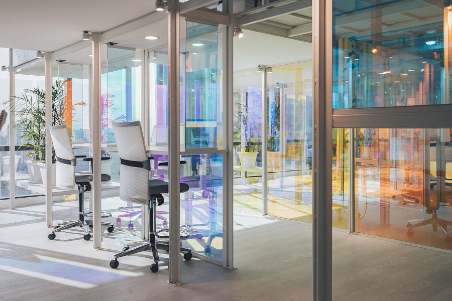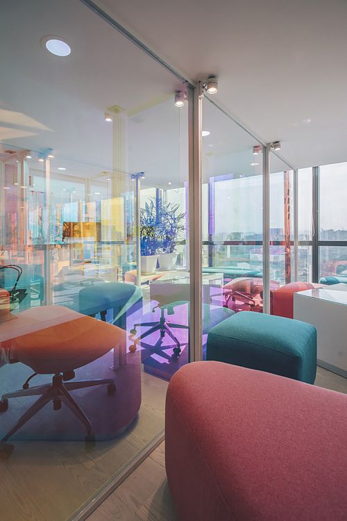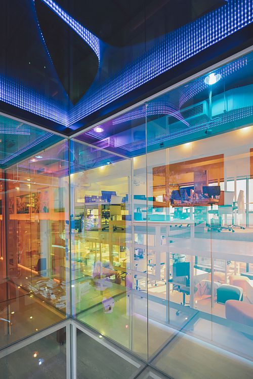 По словам авторов, в качестве объектов вдохновения (пусть и сопоставить их можно с огромным трудом) им пришли на ум, во-первых, Храм Святого Семейства Антонио Гауди, а во-вторых, типичные и всем знакомые детские игровые городки. Казалось бы, странные параллели. Дело в том, что внутреннее пространство офиса представляет собой разноуровневую металлическую каркасную структуру, почти целиком остекленную, причем стекло оклеено специальной дихроической пленкой 3M. Получается оптический эффект: при обзоре с разных углов цвет стекла меняется. Архитекторы уверяют, что схожий эффект можно наблюдать при осмотре протравленных витражей Sagrada Familia. Что касается сравнения с детским городком, то тут авторы скорее стремились передать живость и оригинальность офисной атмосферы.