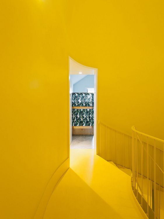 Пространство разделено на девять комнат, располагающихся на трех этажах. Стены каждой комнаты оформлены в белом цвете, а пол сделан из полированного бетона. Помещения соединяются центральной лестничной клеткой, полностью окрашенной в ярко-желтый цвет.