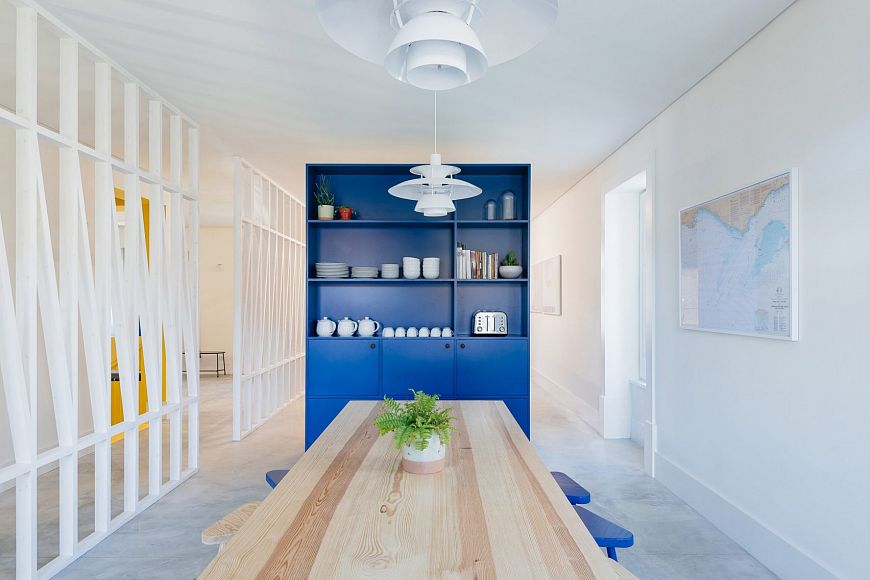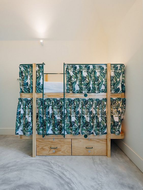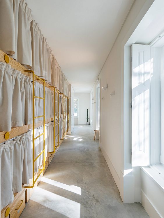 Палитра выдержана в светлых тонах с яркими тропическими акцентами. Хостел расположился в прибрежном городе Кашкайш, куда местные жители и туристы стекаются, чтобы насладиться морем, солнцем и песчаными пляжами. Именно эту атмосферу авторы постарались создать в интерьере.