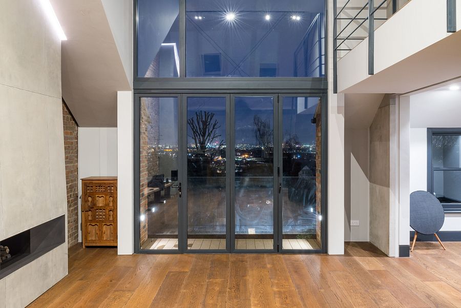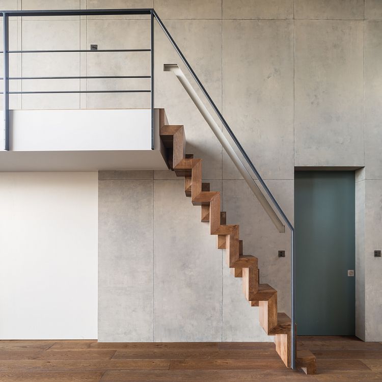 Как правило, в таких случаях архитекторы, используя высоту потолков, обустраивают двухуровневые апартаменты с двухсветным центральным пространством. Однако авторы из JaK Studio поступили не совсем так. Они структурно обозначили мансарду и запроектировали там спальню, отделив ее глухой бетонной стенкой от помещений дневного пребывания. Таким образом появилось большое «церковное» пространство, хорошо освещенное благодаря витражам на фасадах. В мансардной комнате кроме спальни расположена ванная комната и небольшая гардеробная; из мансарды есть выход на открытую террасу. Что касается интерьера, то отделка его минимальна: мы видим очищенный оригинальный кирпич, бетон без декоративных излишеств и металл. Необычная лестница, которую можно использовать в качестве скамьи, сделана из массива дерева.