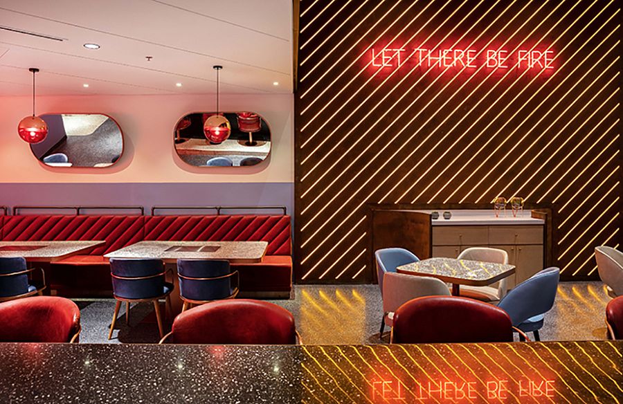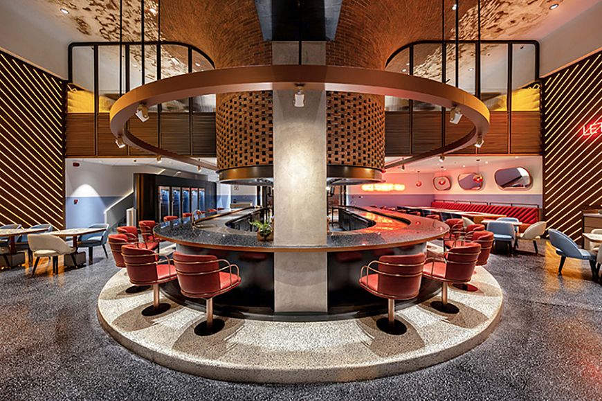 В этом твердо убеждены архитекторы дубайского бюро 4Space, создавшие внутреннее пространство ресторана AtmosFire (площадь более 500 кв.м) в столице эмирата. Основой образного решения интерьера стала зона барбекю, где по праздникам собирается вся семья. Центр композиции заведения – огромная жаровня, выложенная искусственно состаренными кирпичами с измененной геометрией.  Вокруг этой кулинарной зоны, состоящей из шести грилей, располагаются поворачивающиеся кресла для посетителей. Сектор освещен спотами, которые вмонтированы в круглую подвесную конструкцию, отделанную медью. Часть потолка также закрыта медными листами, отполированными до зеркального блеска. В стены заведения встроены группы светодиодов, имитирующие световые датчики грилей. Бар оборудован авторскими полками и системами хранения, сделанными из дерева и стали. Прямой, приглушенный и отраженный свет поддерживает общую образную линию открытого огня и пышущих жаром углей в жаровне.