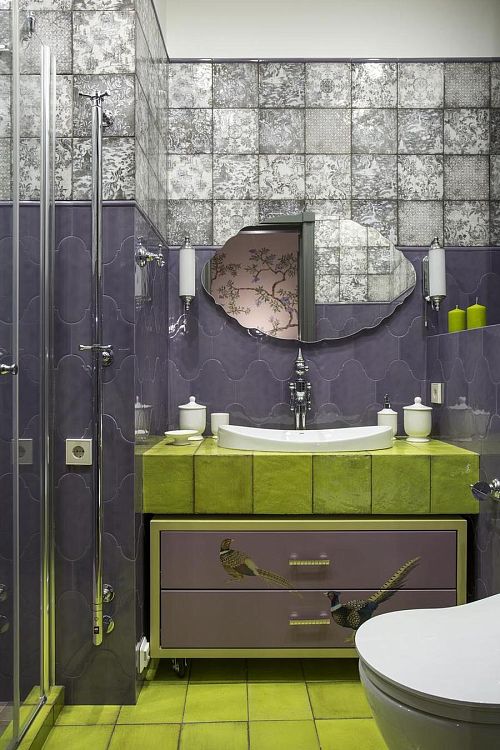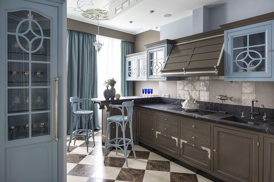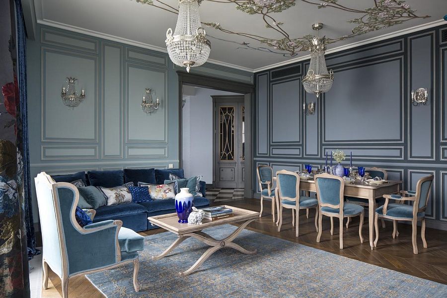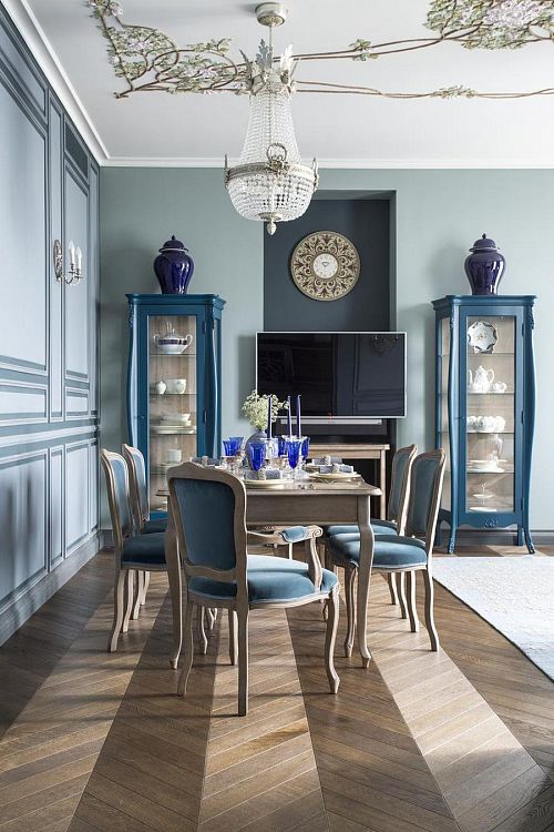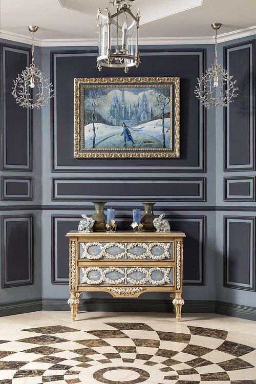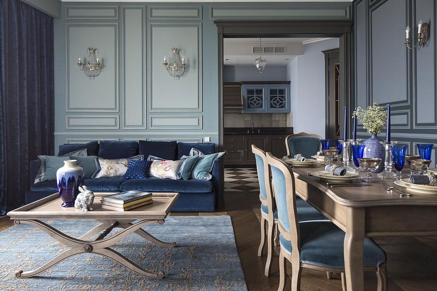 Цветовую гамму для этой квартиры я выбрала торжественную, сине-голубую – для гостиной и насыщенно-лавандовую – для холла. Художник Виктория Фомина специально для этой квартиры написала чудесную картину с замком Снежной Королевы в льдисто-голубых тонах. Комнату родителей я решила сделать в цвет лесного ореха (дымчатый оттенок голубовато-зелёного), в хозяйской спальне пыльно-бирюзовый эффектно оттенила верблюжье-серым оттенком.