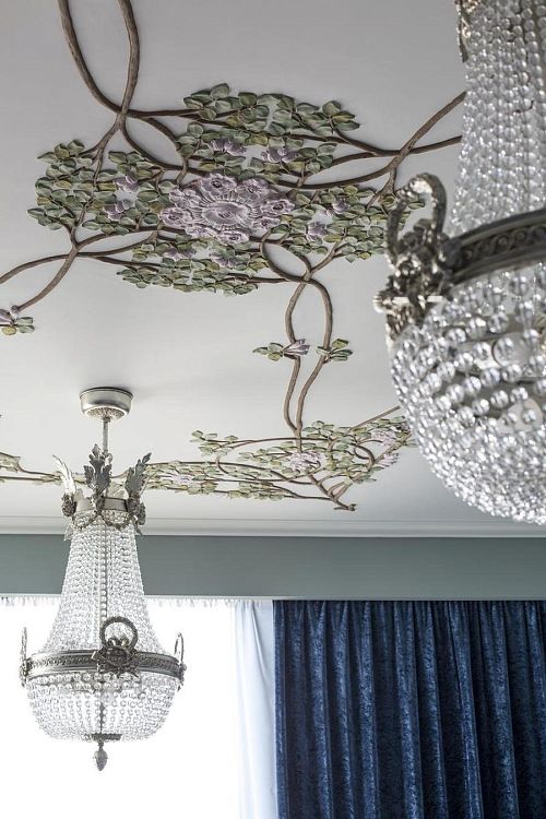 Второй важной составляющей интерьера стала другая находка. Просматривая фотографии одного питерского блогера Романа Везенина, я случайно наткнулась на фото комнаты в старой коммуналке с чудным переплетением яблочных веток на потолке. Внизу был навален хлам, сушилось на веревках белье, а цветы яблони, пережившие и блеск уходящего Серебряного века, и приход новой власти, и гражданскую войну, и холодные зимы блокады, смотрели на все это как небожители, и казалось, что их трепещущие лепестки наполняют ароматом сада старую запущенную комнату. Но воплотить это в жизнь оказалось достаточно сложно. Попасть в квартиру было невозможно, поэтому пришлось рисовать венки из ветвей по фотографиям.