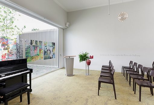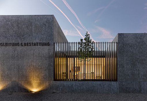 Прощание с усопшими всегда вызывает у людей тяжелые эмоции. Поэтому задача перед архитекторами стояла непростая. Расположение объекта на крупном шумном перекрестке требовало репрезентативного внешнего облика, который, однако, не должен был быть слишком показным. Массивный монолитный объем почти лишен окон. Металлические перфорированные панели с растительными узорами придают фасаду сдержанную изящность. Архитектурный облик словно соткан из контрастов: шум и покой, традиции и новые технологии, жизнь и смерть.
