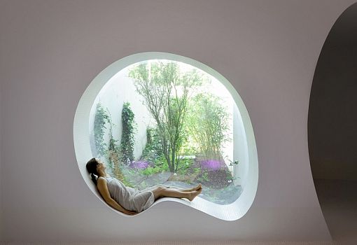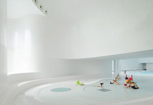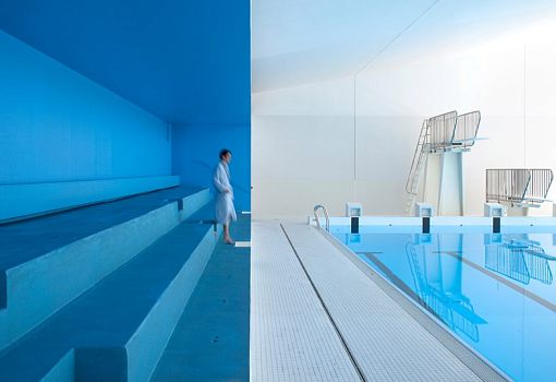 Архитекторы бюро Dominique Coulon et Associés сумели реконструировать и расширить здание бассейна в парижском пригороде Банье, сохранив оригинальную архитектуру 50-х годов.«Сохранение исторического здания позволило сократить стоимость проекта на 40 %», - говорит архитектор Доминик Кулон. Площадь строения увеличилась за счет пристройки, включающей открытую веранду для принятия солнечных ванн, а также детский блок, который помещен внутрь изогнутого кокона. Благодаря иллюминатору в полу бассейна на первом этаже, в помещениях спа-центра, царит интригующая атмосфера морского дна. Кроме того, в бассейне появилась двухуровневая зона отдыха с округлымостекленным проемом, обращенным в небольшой сад.