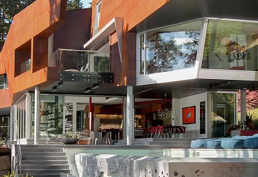 Фасад современного дома, расположенного в заливе Тихого океана на скалистом побережье Британской Колумбии (Канада), действительно покрыт ржавчиной. Этот эффект создает особая сталь (Solanum Steel), которую использовали архитекторы бюро AA Robins Architect для обшивки фасада. Благодаря большой площади остекления и открытым пространствам достигается единство с природой, открываются замечательные виды на залив. При строительстве элементы конструкции изготавливали на материке, после чего транспортировали их на барже, а затем на грузовиках привозили на стройплощадку.