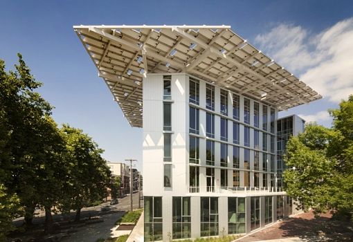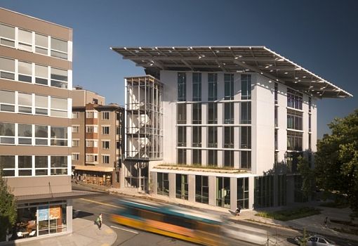 С момента своего открытия «Буллит-центр» в Сиэтле был объявлен самым «зеленым» коммерческим зданием в мире. Теперь это подтверждено сертификатом программы Тhe Living Building Challenge. Авторам постройки удалось выполнить 20 неуклонных требований разработчиков экостандарта. Ноль по выбросам CO2, система очистки сточных вод и сбора дождевой воды, установка солнечных батарей на крыше – вот только несколько особенностей этого объекта. Хотя центр будет подключен к городской электросети, и может время от времени потреблять больше энергии, чем производит (особенно в зимний период), в течение теплых месяцев он должен произвести достаточно энергии, чтобы «погасить» дефицит и достигнуть годового нулевого баланса. Геотермальные скважины глубиной 120 метров, где температура является постоянной и составляет 12 °C, помогают обогреть здание в зимний период и охладить летом. Здание построено из трех основных материалов – дерево, бетон и сталь. Они местного происхождения и произведены с использованием вторичных материалов. В «Буллит-центре» продумана каждая мелочь, включая безопасное хранение велосипедов с возможностью их мойки и ремонта для поощрения езды на экологически чистом автотранспорте.